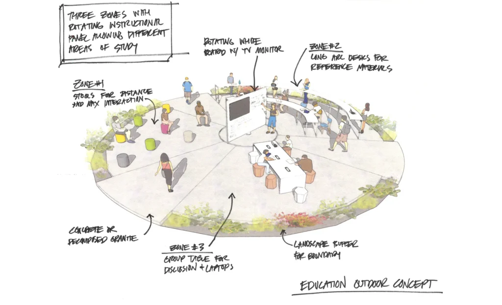 The 19six Learning Environments Group circled up (virtually) during the early shelter-in-place days of the pandemic to start a dialog on how the learning landscape was changing. We ideated about materials, programming, and the adaptability of existing classrooms in this new COVID world. One common thread in our discussions was the idea of indoor vs. outdoor learning. Was the later even feasible? Perhaps outdoor learning will become the more desired “classroom” with the inclusion of exterior fans, shade sails, and misters to keep the environment comfortable. The understanding that connecting to nature is innate in our human psyche inspired a lot of clever, unconventional thinking.