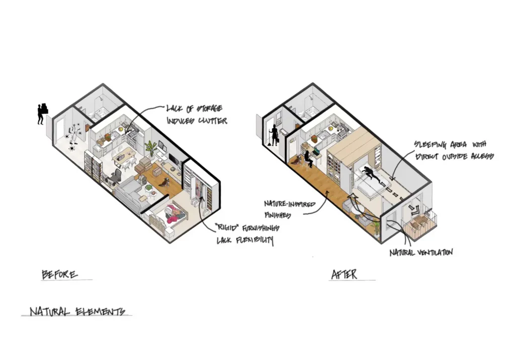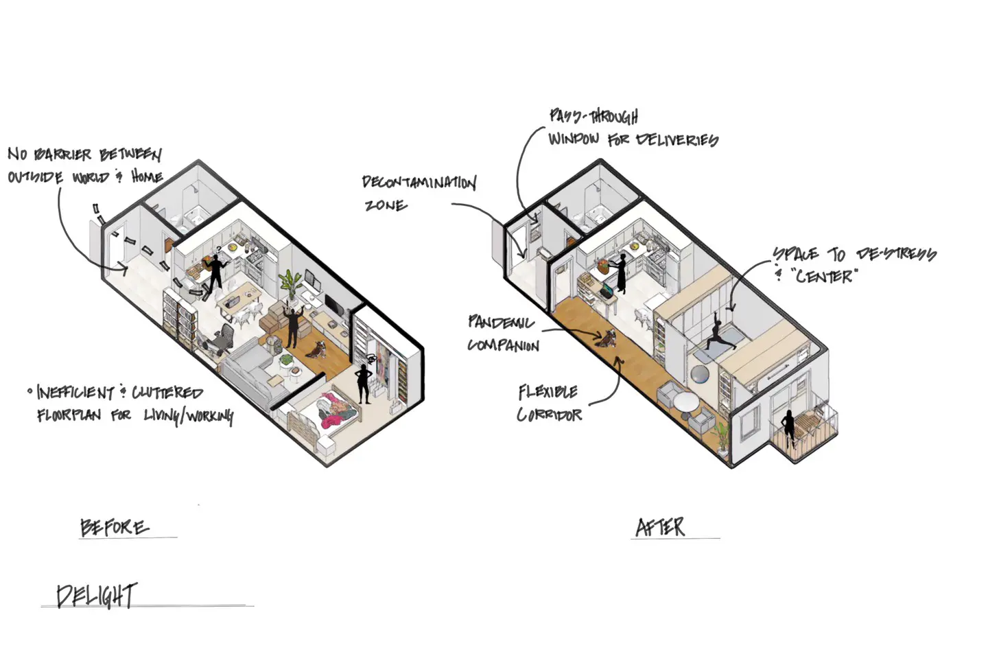 At 19six, we’ve observed how living spaces had been reconfigured during the time of shelter-in-place, but we were especially interested in what this meant for the future of multi‐family housing. Urban dimensions of shelter are typically more compact than suburban and rural homes. A studio apartment needs to be a ‘transformer’ literally. It’s a sleeping space for 8 hours, a working space for 8+ hours, and social/relaxing space for the balance of the day.