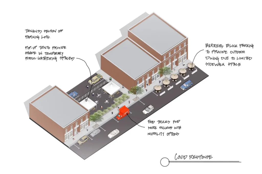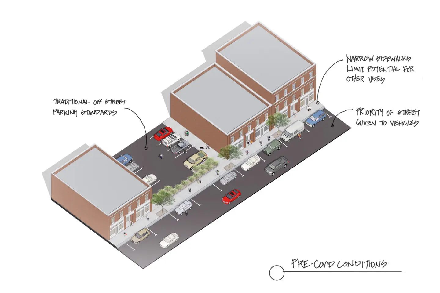 Looking back at the pre-COVID world in any-town USA, you might find a scene like the one illustrated here. Depending on a city’s size and scale, it might look a bit different, but the premise would still be the same. Commercial and service buildings pushed up to the setback line with the number of off-street parking stalls maximized. People sidestepping when passing one another. Cars the dominant force in this ecosystem; priority given to vehicles over pedestrians. Sidewalks narrowed to provide parallel parking on the street—urban trees planted in narrow sidewalks competing with pedestrian circulation.