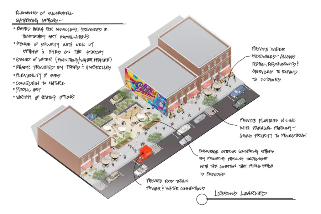 People craved outdoor public spaces to socialize. Where they didn’t exist in the pre-pandemic design, they were created by recapturing space from parking lots. The public realm should be designed for the users’ experience and not organized around the vehicle used for mobility. Communities should be prioritized for people, not cars. With our current understanding of the future of mobility, parking counts should be evaluated against the benefit of providing quality public open space.